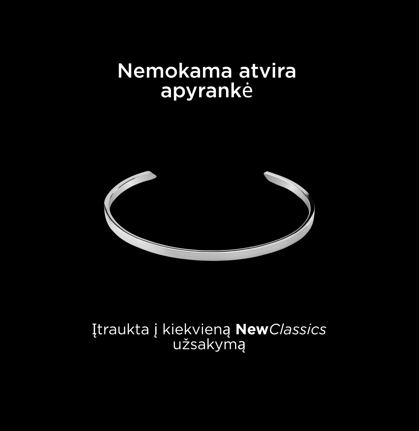 Pasirinkite bet kurį NewClassics papuošalą šiame puslapyje, ir nemokama atvira apyrankė bus automatiškai pridėta. Nėra minimalios pirkimo sumos ar nuolaidos kodo. Tiesiog minimalistinis, nerūdijančio plieno bazinis papuošalas – mūsų dovana naujos kolekcijos proga.